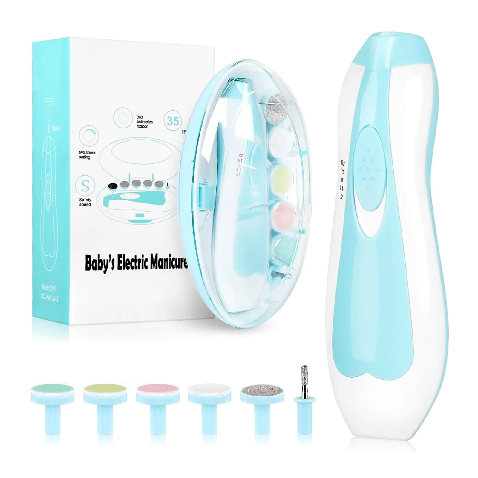 [❤【Baby Nail Clippers 6 in 1】This baby nail file with 6 different grinding heads. This electric nail trimmer is suitable for babies kids adults. You can choose a suitable grinding head according to the different growth stages of your baby. Metal grinding heads and rod are suitable for adults to use for manicure. Suitable for all ages. ❤【Safe and Fast】This baby nail trimmer electric is safer and faster to use and no need as careful as use traditional nail clippers. Use this baby grooming kit to polish and trim your nails without damaging your fingers and quickly get the shape and size you want. Powered by 2 AA batteries (not included). "❤【Noiseless Design】The volume of this baby nail file is only 35 dB. When your baby is sleeping you can use this nail trimmer to grand your babys nail will not disturb your babys sleep and you can trim and care for your nails in dim and dark environment." ❤【2 Rotations and 4 Modes】With this electric nail trimmer you can choose the direction of rotation and speed according to you needs. Clockwise counterclockwise high and low speed. Ergonomically designed it can be operated with one hand. "❤【Easy to carry】In the package there is a nice storage box that fits into a set of grinding heads and a trimmer. Its portable and you can take a nail care kit with you wherever you go. Of course this nail care kit is the best choice and gift."]